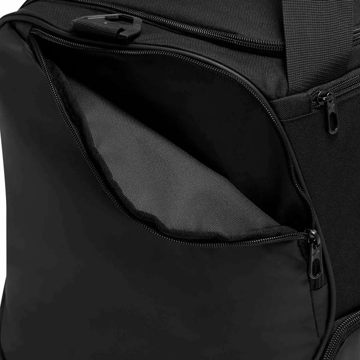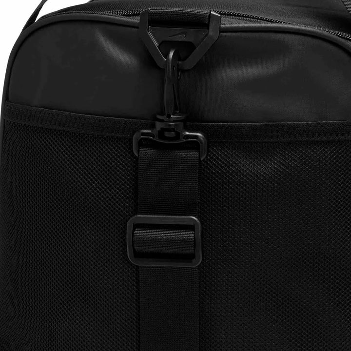 La Nike Academy Team Duffel Bag (ref. CU8090-010) es una bolsa deportiva diseñada para ofrecer funcionalidad y estilo tanto dentro como fuera del campo. Con una capacidad de 60 litros, es ideal para transportar tu equipo de entrenamiento, incluyendo balón, calzado y ropa. Su compartimento principal espacioso permite organizar tus pertenencias de manera eficiente, mientras que el compartimento inferior con cremallera mantiene la ropa seca separada de la mojada. Las correas de hombro y las asas de mano ofrecen múltiples opciones de transporte para mayor comodidad. Disponible en un elegante color negro con detalles en blanco, esta bolsa combina durabilidad y diseño práctico para el deportista moderno.