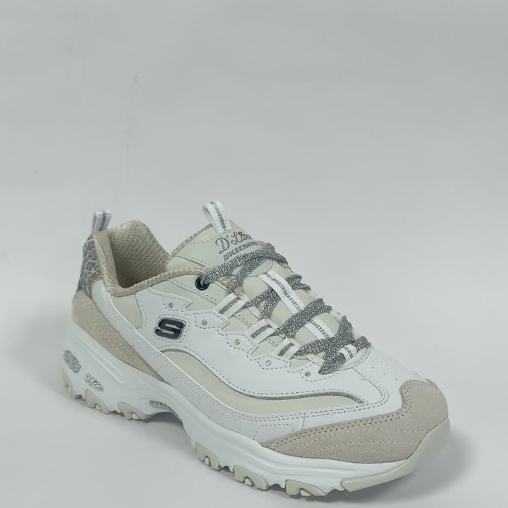 Luce un estilo salvaje y cómodo con las Skechers D'Lites®. Estas zapatillas de moda con cordones tienen una parte superior de cuero y material sintético con un detalle de estampado animal y una plantilla acolchada Skechers Air-Cooled Memory Foam®.