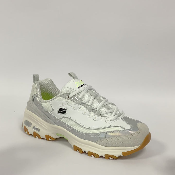 Los Skechers D'Lites - Dazzling Shine (ref. 150556-WGY) son una versión moderna y brillante de los clásicos D'Lites. Con una combinación de colores blanco y gris, estos tenis ofrecen un look limpio y versátil que se adapta a cualquier estilo. Diseñados para quienes buscan comodidad sin sacrificar el estilo, estos tenis cuentan con la tecnología Air-Cooled Memory Foam®, que proporciona una amortiguación suave y ventilación para mantener los pies frescos durante todo el día. Su suela flexible con tracción confiable los hace ideales para caminar por la ciudad o para uso diario.