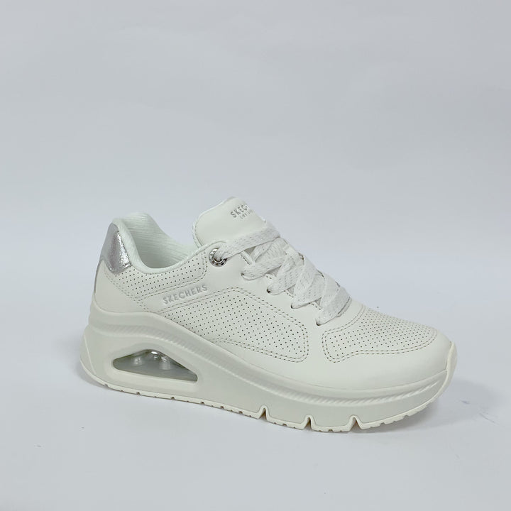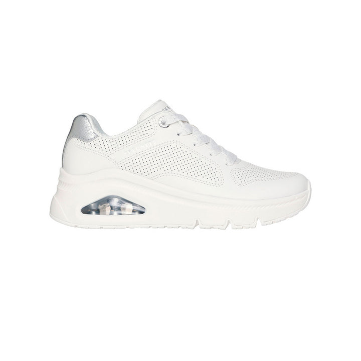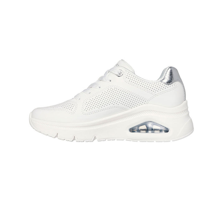 Los Skechers UNO Icon Mujer (ref. 177767-WHT) son la combinación perfecta entre estilo urbano y comodidad. Con un diseño moderno y elegante, estos tenis están pensados para quienes buscan destacar sin sacrificar confort. Su parte superior de cuero perforado con detalles metálicos añade un toque de sofisticación, mientras que la plantilla Air-Cooled Memory Foam® y la entresuela con cámara de aire visible Skech-Air® garantizan una caminata cómoda y amortiguada. Ideales para el día a día, ofrecen versatilidad y estilo en cada paso.