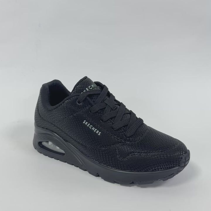 Los Skechers UNO - Shiny Scale (ref. 177861-BBK) son el equilibrio perfecto entre estilo urbano y comodidad. Con un diseño llamativo y moderno, estos tenis están pensados para quienes buscan destacar sin sacrificar confort. Su parte superior de durabuck con estampado de escamas reflectantes añade un toque de originalidad, mientras que la plantilla Air-Cooled Memory Foam® y la entresuela con cámara de aire visible Skech-Air® garantizan una caminata cómoda y amortiguada. Ideales para el día a día, ofrecen versatilidad y estilo en cada paso.
