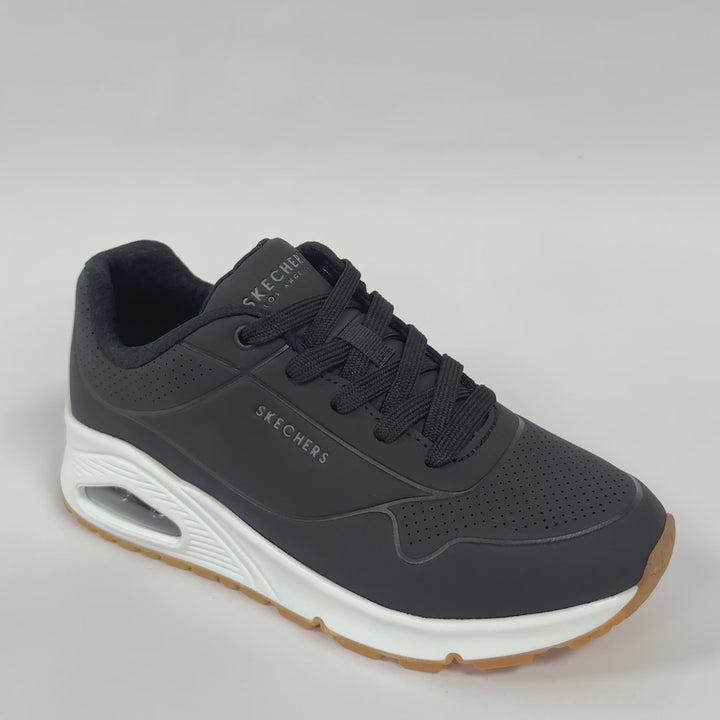 La comodidad clásica con amortiguación de aire recibe una nueva actualización en Skechers Street™ Uno - Stand on Air. Este estilo de moda con cordones presenta una parte superior sintética suave perforada con una plantilla Memory Foam refrigerada por aire y una entresuela con amortiguación de aire visible Skech-Air.